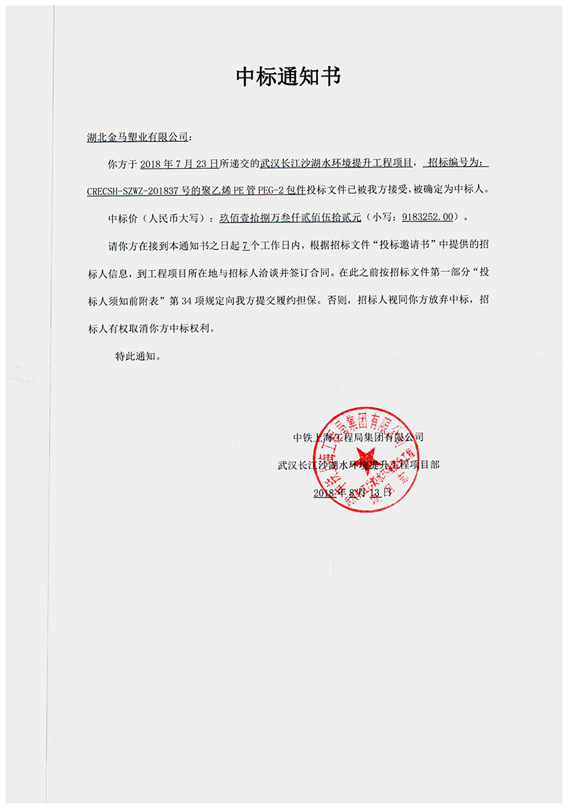 公司新聞 網(wǎng)站首頁(yè) > 公司新聞 公司中標(biāo)900萬(wàn)元中鐵集團(tuán)武漢長(zhǎng)江沙湖水環(huán)境提升工程項(xiàng)目 2021-03-24 閱讀 39277 上一篇: 祝賀金馬塑業(yè)中標(biāo)當(dāng)陽(yáng)市安全飲水工程600萬(wàn)元項(xiàng)目 下一篇: 公司中標(biāo)鄖西縣 1400萬(wàn)元精準(zhǔn)扶貧農(nóng)村飲水安全項(xiàng)目