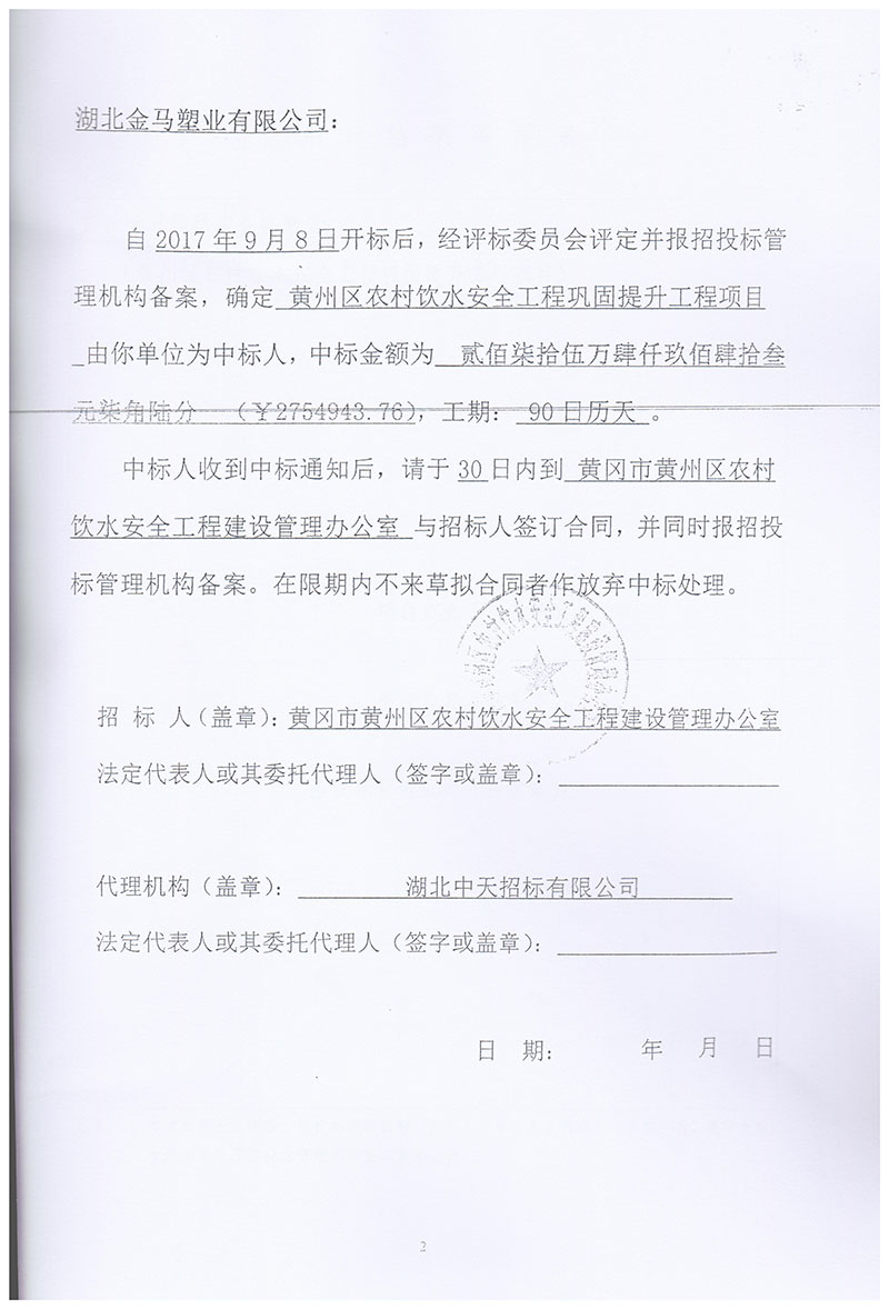 公司新聞 網(wǎng)站首頁 > 公司新聞 黃州區(qū)農(nóng)村飲水安全工程鞏固提升工程項目 2021-03-24 閱讀 118688 上一篇: 祝賀金馬塑業(yè)中標通城縣大坪水廠改擴建工程管材采購及安裝項目 下一篇: 祝賀金馬塑業(yè)中標湘陰縣2018年農(nóng)村飲水安全環(huán)保督察項目