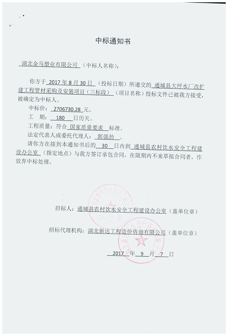 公司新聞 網(wǎng)站首頁 > 公司新聞 祝賀金馬塑業(yè)中標通城縣大坪水廠改擴建工程管材采購及安裝項目 2021-03-24 閱讀 122233 上一篇: 祝賀金馬塑業(yè)中標東蘭縣三石鎮(zhèn)富硒米示范基地高效節(jié)水灌溉工程 下一篇: 黃州區(qū)農村飲水安全工程鞏固提升工程項目